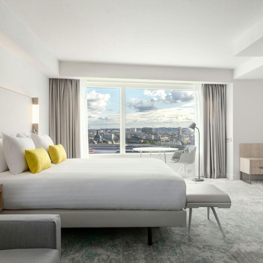 C'est à partir du 9e étage que l'hôtel révèle ce qui fait sa singularité. Sur les 249 chambres, environ 150 offrent un panorama remarquable sur les toits de Paris. Depuis les grandes baies vitrées qui courent le long de la façade, vous découvrez la Tour Eiffel, le dôme du Panthéon, la silhouette du Sacré-Cœur, le clocher de la gare de Lyon, le Centre Pompidou ou encore le Génie de la Bastille. Cette juxtaposition de monuments, particulièrement saisissante à la tombée de la nuit, transforme la chambre en un balcon sur la capitale.