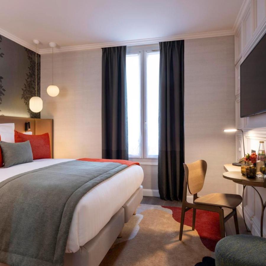 Die 44 Zimmer und Suiten pflegen einen sorgfältigen Stil, der von der Natur inspiriert ist. Holz, mineralische Texturen und pflanzliche Akzente schaffen eine sanfte und zeitgemäße Atmosphäre. Jeder Raum ist maßgeschneidert gestaltet, sowohl für Ruhe als auch für Arbeitsmomente, mit einem diskreten Schreibtischbereich. Einige Zimmer verfügen über einen Balkon, andere bieten teilweise Ausblicke auf die Dächer oder die ikonische Silhouette des Eiffelturms.