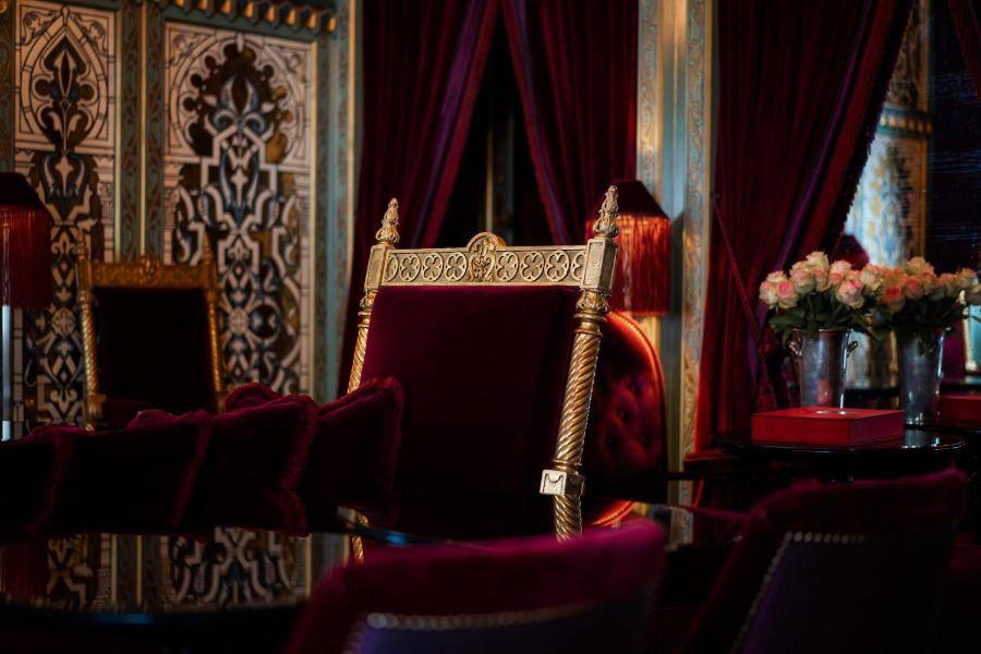 Beim Betreten des Eingangsbereichs lassen Sie die Hektik des modernen Paris hinter sich und tauchen in ein Dekor ein, in dem Samt, Holzverkleidungen, Spiegel und Seidenstoffe in gedämpften Licht harmonieren. Die Handschrift von Jacques Garcia, Meister der Inszenierungskunst, hat hier ein Theater der Emotionen geschaffen, das gleichermaßen gedämpft und strahlend ist. Jeder durchgehende Salon verlängert das Gefühl von Anderswo: hier ein Murano-Kronleuchter, dort ein monumentaler Kamin, umgeben von gepolsterten Sesseln, weiter entfernt ein Wintergarten mit orientalischen Linien. Das Ganze erinnert an ein Märchen, in dem Sie einer der Protagonisten werden.