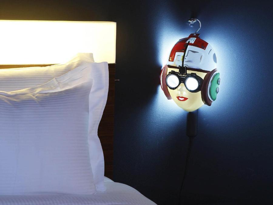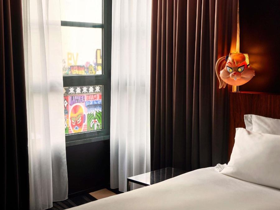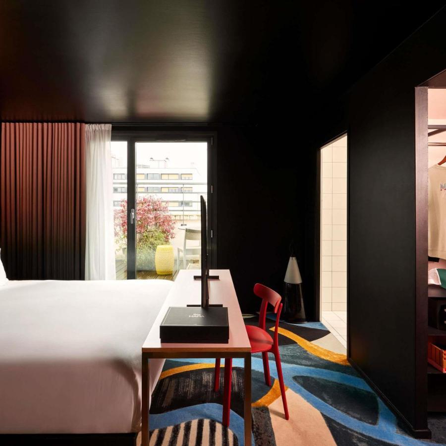 Das Innere des Hauses trägt in jedem Detail die Handschrift von Philippe Starck. Roher Beton trifft auf Leuchten in Form von Superheldenmasken, die Raumvolumen sind großzügig, die Farben klar und die Möbel spielen mit Kontrasten. Diese ästhetische Haltung ist streng und voll bewusst gewählt: Sie wird jene ansprechen, die schiefe Ambientes und Räume mit viel Persönlichkeit mögen, kann aber Reisende überraschen, die ein klassischeres oder minimalistisches Umfeld suchen. Genau diese Kohärenz zwischen Ort, Viertel und Design macht die Identität von Mama Shelter aus, und man sollte das lieber vor der Ankunft wissen, als es erst an der Rezeption zu entdecken.