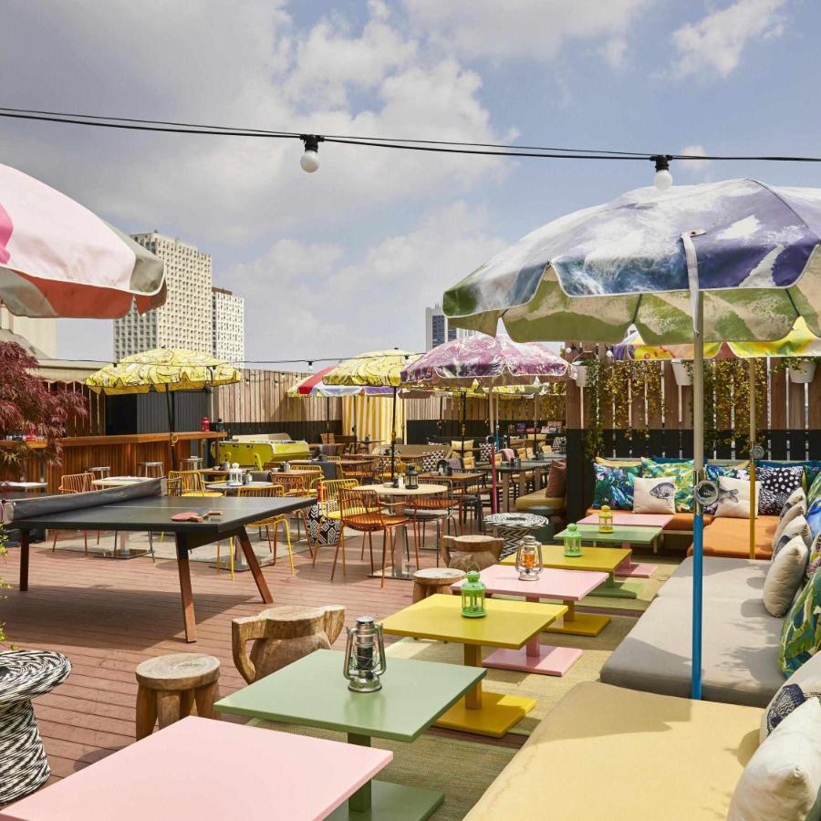 Wenn die schönen Tage kommen, wird das Rooftop zum Treffpunkt des ganzen Hotels. Dort genießt man Cocktails, während man zusieht, wie sich die Dächer von Paris unter dem Himmel ausbreiten, man macht es sich für eine Pause in einer Hängematte bequem oder spielt eine Partie Tischtennis mit jemandem, den man an der Rezeption getroffen hat. Die Stimmung ist entspannt und gesellig, ganz im Sinne dessen, was Mama Shelter bietet.