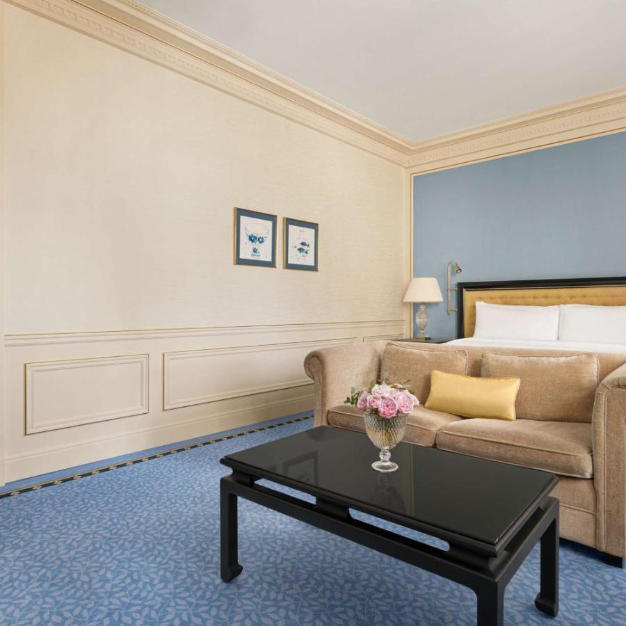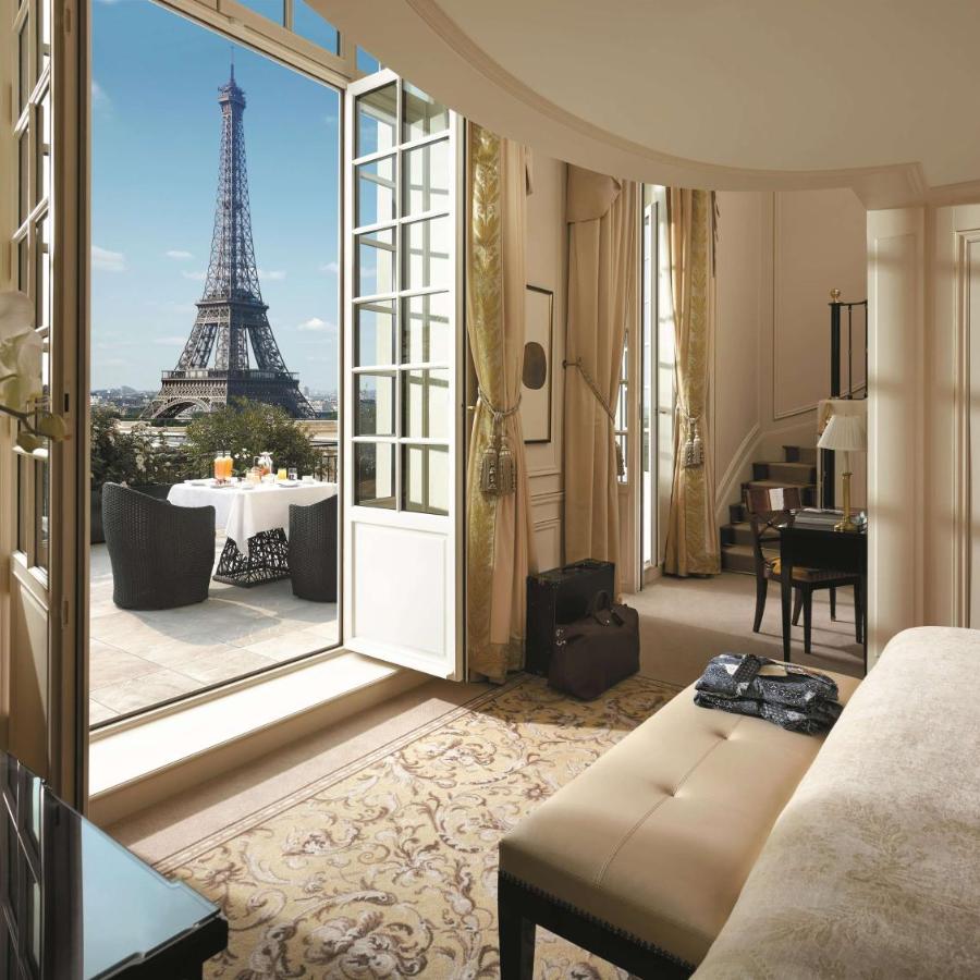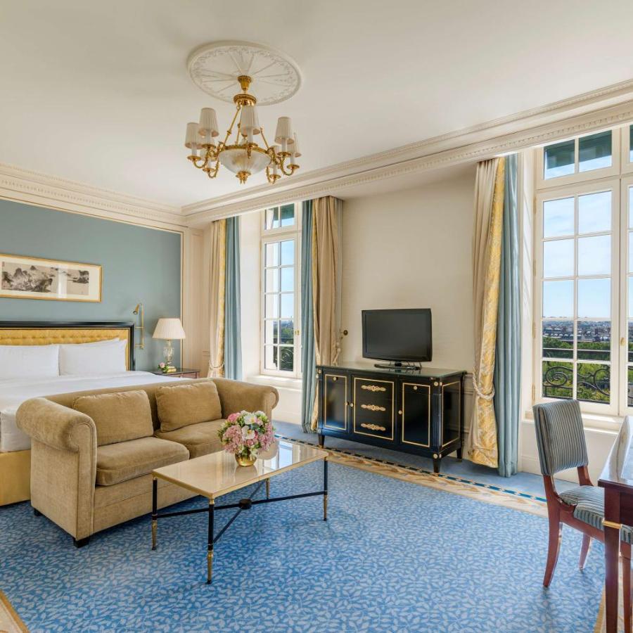 Für diejenigen, die das Außergewöhnliche suchen, bieten einige Suiten eine private Terrasse, von der aus Sie den Eiffelturm in all seiner Majestät bewundern können. Diese Räume sind echte Pariser Apartments mit separaten Salons, begehbaren Kleiderschränken, beheizten Marmorbädern und manchmal sogar einer Butlerküche. Die Shangri-La Suite, die sich im obersten Stockwerk befindet, bietet einen Panoramablick auf Paris, den nur wenige Orte übertreffen können.