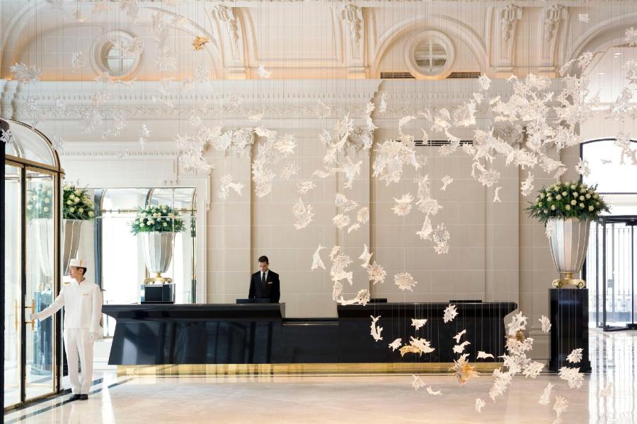 Beim Durchschreiten der Glastüren des Haupteingangs wird Ihr Blick sofort von einem monumentalen Kronleuchter mit kristallinen Reflexen angezogen, der wie eine zeitgenössische Hommage an die Platanen der Avenue Kléber schwebt. Der erste Eindruck ist beeindruckend. Sie befinden sich an einem Ort, der die großen diplomatischen Stunden des 20. Jahrhunderts erlebt hat, während er Ihnen die Ruhe eines Rückzugsortes bietet, der der Schönheit, der Kunst und der Exzellenz im Service gewidmet ist.