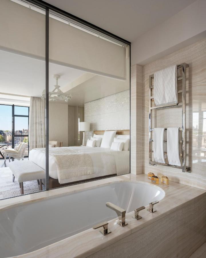 Some suites extend into a winter garden or a private terrace suspended above the city. In the morning, you can enjoy breakfast there while watching the reflections of the sky on the Seine. Inside, light marble bathrooms combine aesthetics and well-being. Hammam showers, deep bathtubs, and separate dressing rooms provide a tailored bubble of comfort.