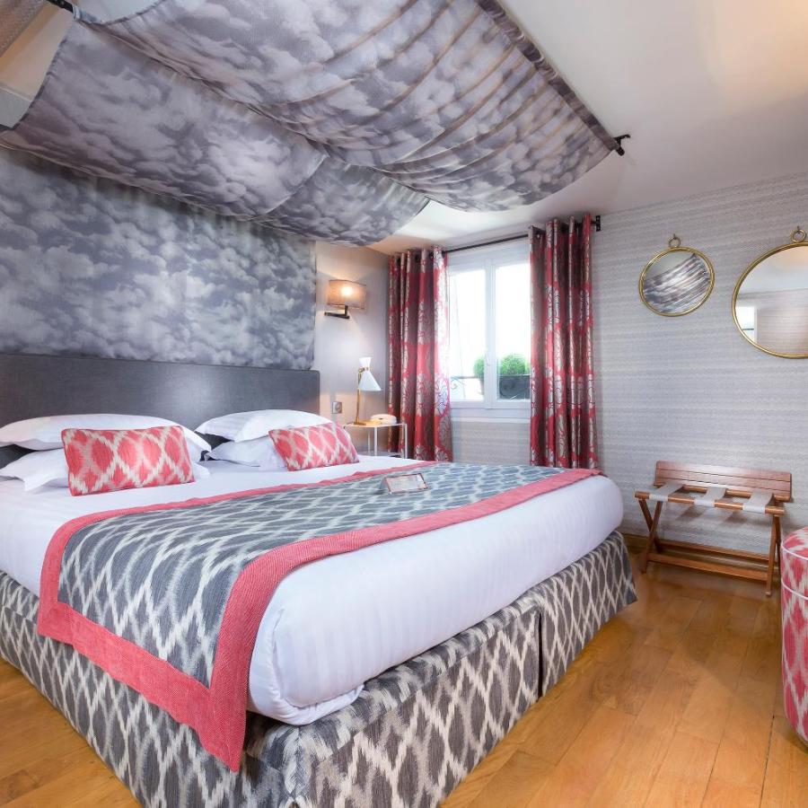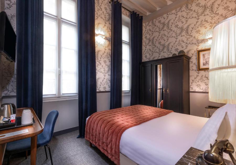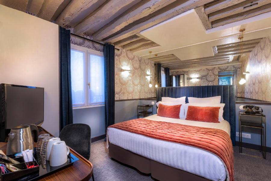 The rooms exude an intimate atmosphere, characterized by warm tones, refined fabrics, and classic-inspired furniture. Some feature exposed beams or offer unobstructed views of Parisian rooftops, adding an extra touch of authenticity sought by so many travelers. The carefully selected bedding ensures restful nights, while soundproofing preserves tranquility in this central environment.