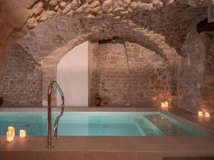 One of Hôtel Madeleine de Senlis's distinctive features is located underground: a pool inspired by Roman baths, hidden beneath four stone vaults. The subdued lighting, exposed stones, and clean lines create an ambiance conducive to relaxation. This discreet space is accessible for free by reservation, in private slots during the day, or with calmer open access in the evening.