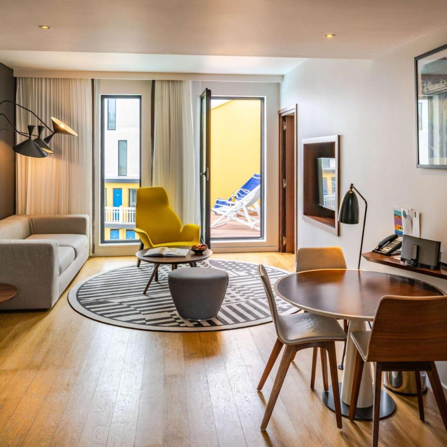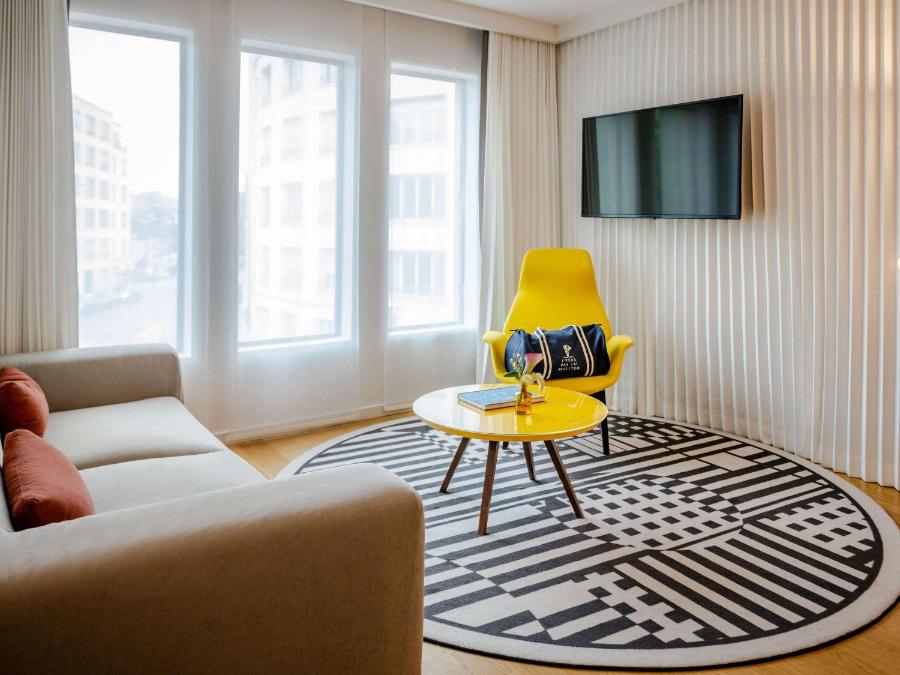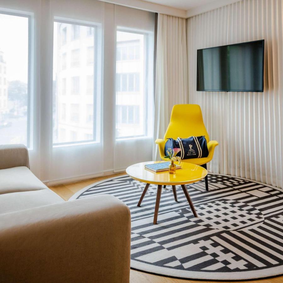 You access the spaces as if stepping into sequences of a film in which you are the main actor. The lobby immediately sets the tone: a tagged Rolls Royce stands as a manifesto work in the middle of a cozy space, signaling that this hotel is not just a temple of luxury but also a place of artistic expression and boldness. Every corner of Molitor holds a surprise, a piece of street art, a painted cabin, a nod to the past.