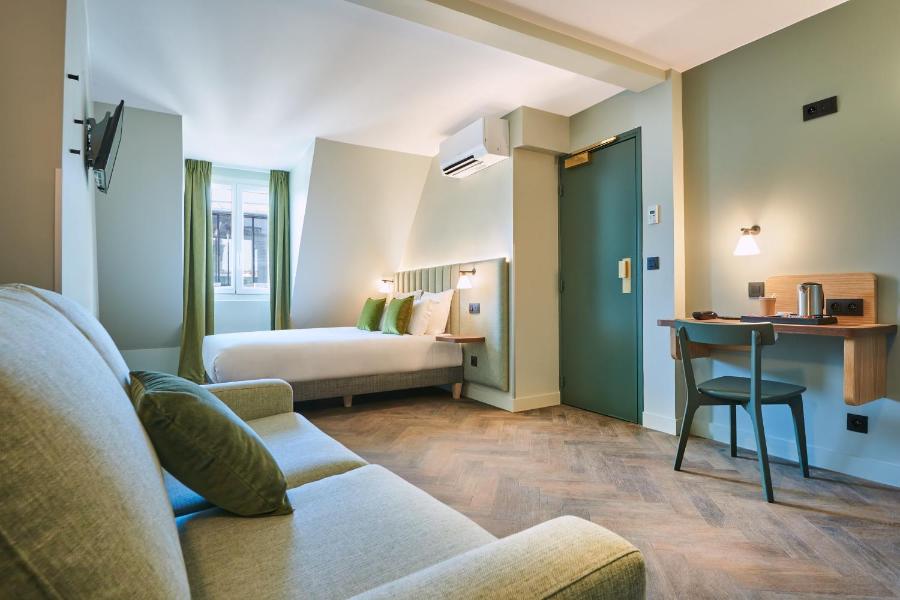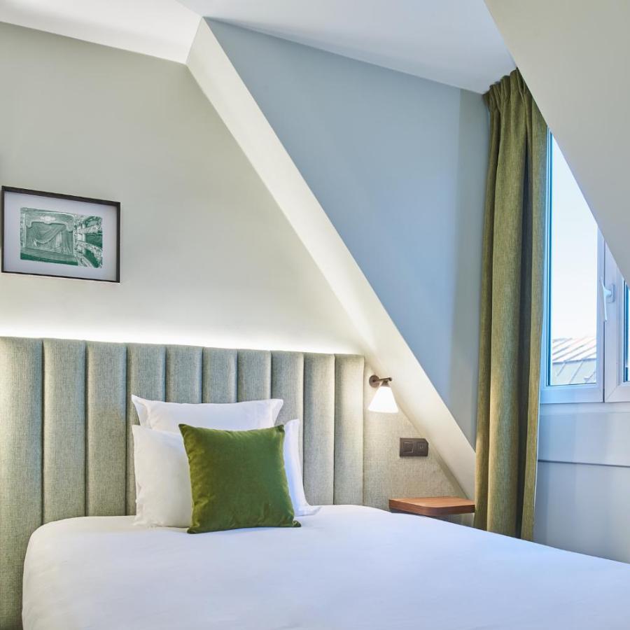 In a soothing atmosphere that pleasantly contrasts with the hustle and bustle of the surrounding boulevards, Hotel 10 Opéra offers a place to stay designed for those who wish to combine comfort, tranquility, and centrality in Paris. Here, the spaces are arranged with clarity, the proportions are carefully managed, and the ambiance invites relaxation. Light wood, soft tones, a few green touches, and graphic elements discreetly punctuate the spaces. This elegant simplicity provides a harmonious experience, blending minimalist style with a sense of well-being.