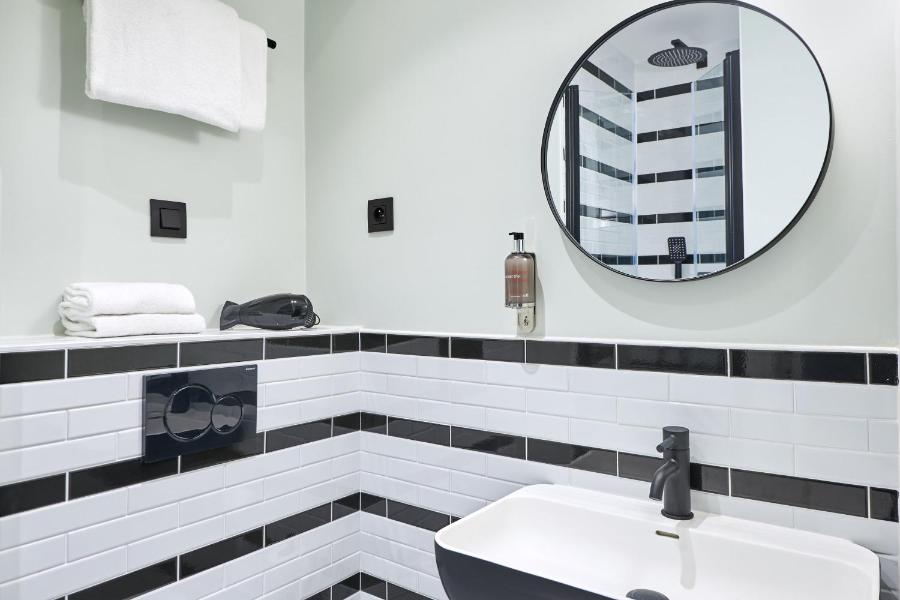 The rooms are soundproofed to ensure your rest, and the layout prioritizes intuitive use without visual overload. The overall design remains faithful to the hotel's aesthetic: clean lines, simple-shaped furniture, and decorative touches that bring a discreet identity to each space. The experience extends to the bathrooms, where geometric lines complement materials that are pleasant to the touch.
