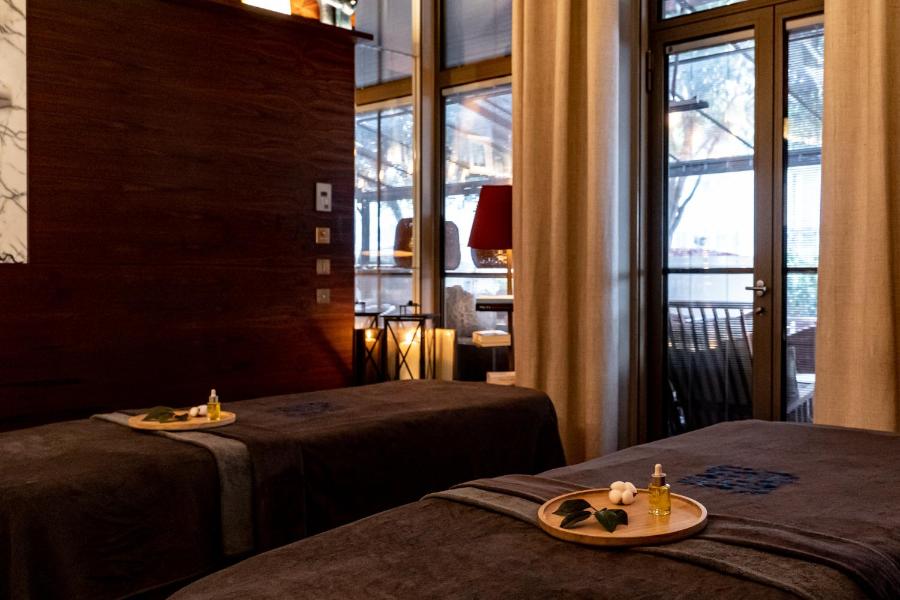 Si vous souhaitez aller plus loin dans l’expérience de bien-être, les suites de soin signées Clarins vous accueillent dans une ambiance enveloppante et tamisée. Soins du corps et du visage y sont dispensés dans des cabines doubles ou individuelles, dans un décor qui prolonge la philosophie du lieu : chaleur, matières naturelles et sens du détail.