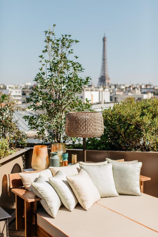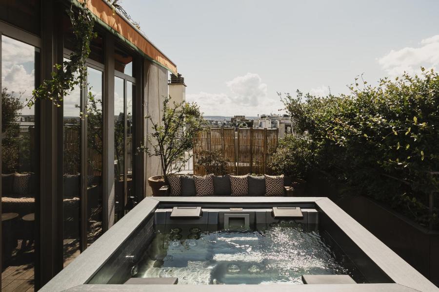 Certaines chambres s’ouvrent sur des terrasses privées qui prolongent l’expérience vers l’extérieur. Depuis ces espaces arborés, vous contemplez les toits de Paris, parfois même la silhouette emblématique de la Tour Eiffel. En soirée, ces panoramas deviennent les complices d’un moment suspendu, un verre à la main, à l’abri de l’agitation.