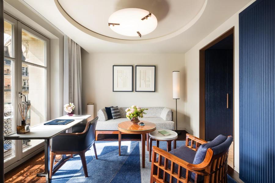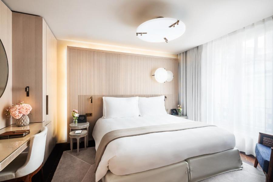 Lorsque vous gagnez votre chambre, un sentiment de calme raffiné s’installe. La décoration y conjugue lignes graphiques et matériaux précieux, dans un équilibre subtil entre mémoire du lieu et contemporanéité. Parquet en chevrons, textiles de maisons emblématiques, mobilier aux accents Art déco : rien ne crie le luxe, tout l’exprime par la retenue. Certaines chambres s’ouvrent sur la rue de Sèvres ou le boulevard Raspail, d’autres donnent sur un patio plus discret, et quelques-unes offrent, depuis leurs balcons filants, des échappées précieuses vers la tour Eiffel.