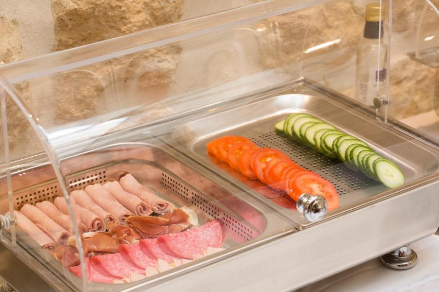 La mattina, una colazione a buffet viene proposta in una sala a volta con pietre a vista. L'atmosfera è conviviale e la selezione, composta da prodotti freschi e di qualità, consente di iniziare la giornata piacevolmente: bevande calde, viennoiserie, frutta, uova, cereali o salumi. Per una maggiore intimità, è disponibile anche un servizio in camera.