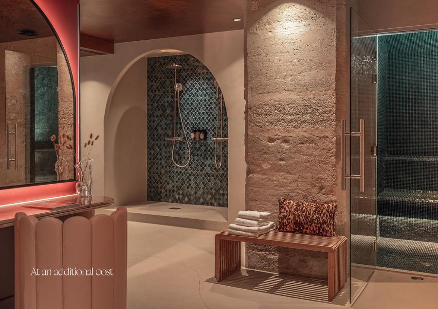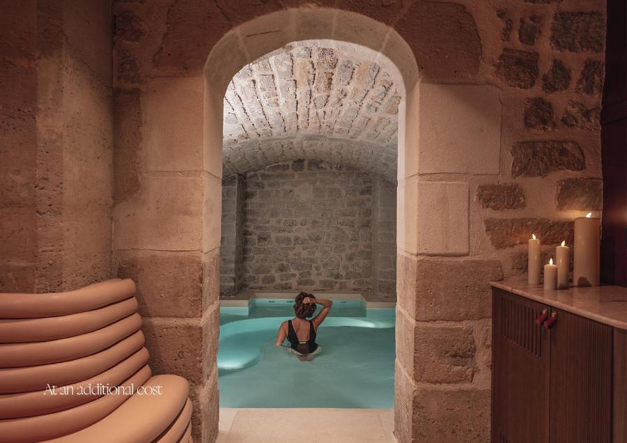 L'hotel apre anche le porte di due saloni da bagno privatizzabili, veri e propri santuari di relax. Il primo, scolpito nella pietra d'epoca, include una piscina e un hammam. Il secondo, immerso nel verde smeraldo, vi accoglie con una jacuzzi e una sauna. In entrambi, i materiali pregiati e le luci soffuse vi avvolgono in un comfort quasi onirico, pensato per farvi perdere la cognizione del tempo.