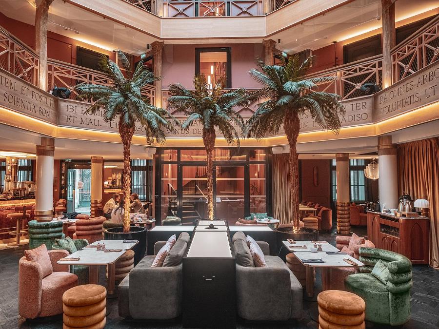 Si accede poi a un atrio spettacolare, pezzo centrale della struttura, sormontato da una grande vetrata d'epoca che diffonde una luce soffusa sulle balconate a spirale. Su cinque livelli, queste servono le 28 camere e suite, concepite come logge, in omaggio alla vocazione teatrale originaria del luogo. La scena si gioca ora tra architettura, design e arte vivente, in un decor tanto evocativo quanto inatteso.