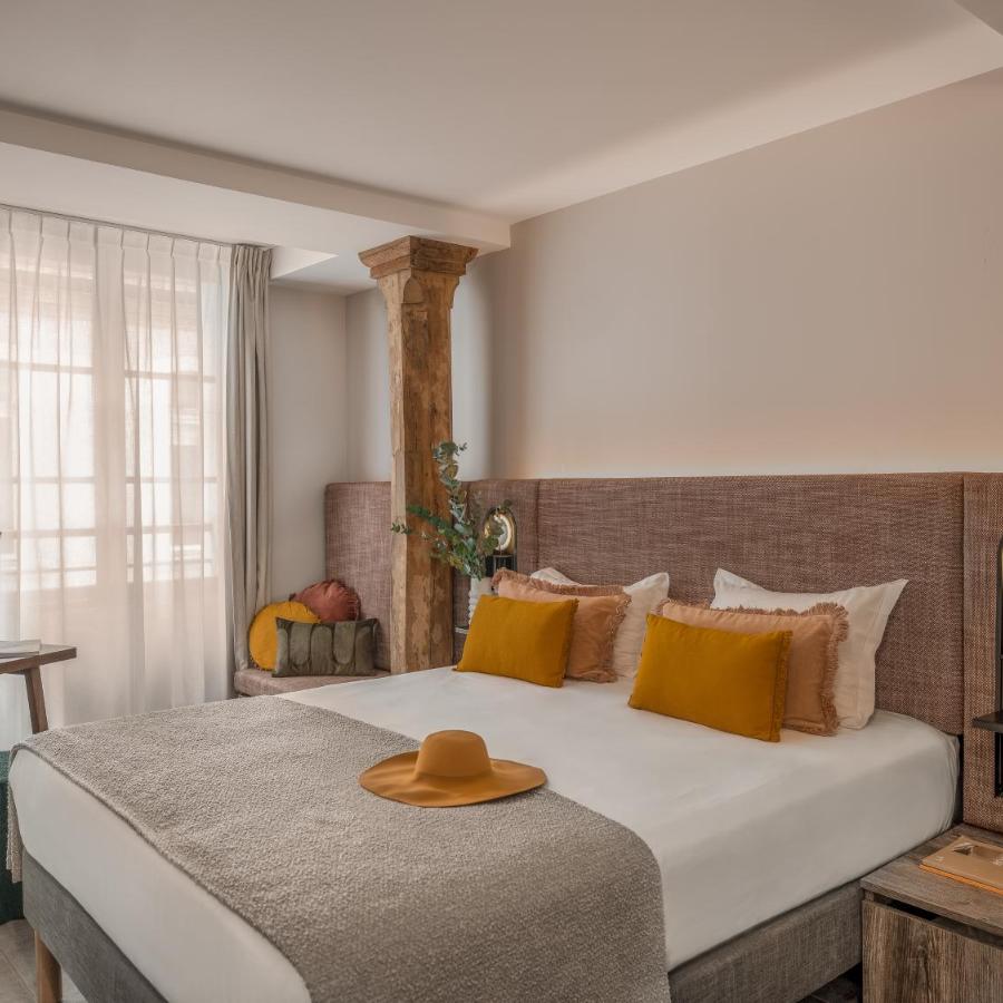 Le camere, in contrasto volontario con le aree comuni, privilegiano la chiarezza e la sobrietà. Toni tenui, materiali naturali, tessuti avvolgenti creano un universo favorevole al riposo. Alcune si affacciano sui tetti di Parigi, altre sull'atrio. Tutte sfoggiano ritratti di muse contemporanee, figure femminili forti, che vegliano discretamente sull'atmosfera del luogo.