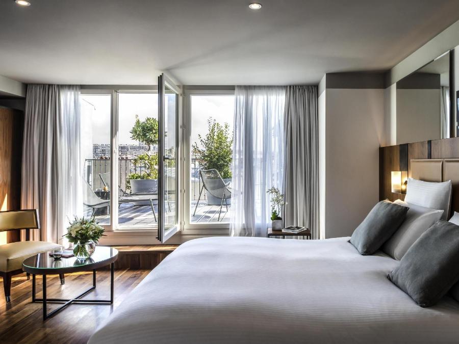 L’hotel conta ottanta camere e suite, ciascuna pensata in modo unico, nel rispetto dei volumi e della luce. Alcune dispongono di una terrazza verde, sospesa sopra i tetti di Parigi, offrendo una parentesi intima e aperta sulla città. Apprezzerete il comfort delle attrezzature moderne, la generosità dello spazio, ma soprattutto l’identità affermata di ogni camera, vera estensione del luogo.